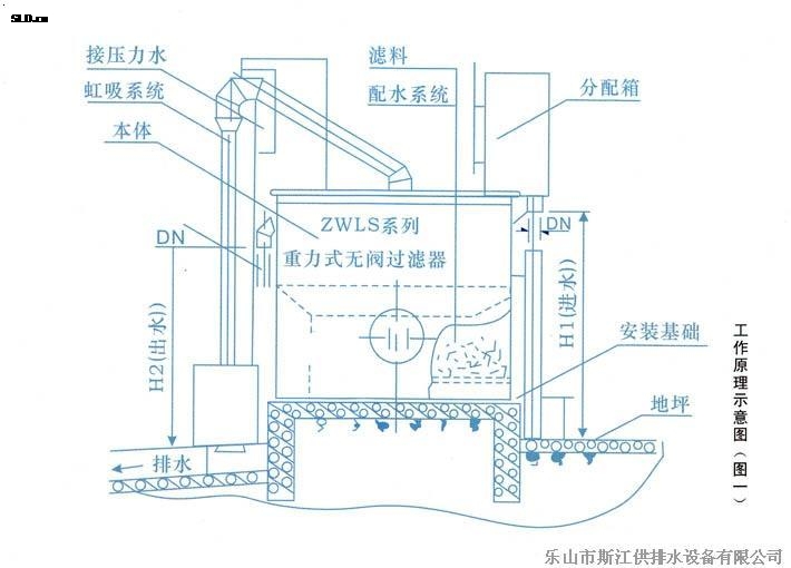 原水不斷自進(jìn)水管進(jìn)入虹吸上升管在輔助虹吸管的管口處,進(jìn)入輔助虹吸管并沿該管下跌,在下跌過程中通過“抽氣三通”,并帶走“抽氣三通”側(cè)管內(nèi)的空氣,而“抽氣三通”側(cè)管是連接虹吸管系統(tǒng)倒置U型管頂部的,這樣,“抽氣三通”就抽吸了虹吸管系統(tǒng)倒置U型管頂部和虹吸下降管內(nèi)的空氣,由于虹吸下降管的下部管口在排水水封內(nèi)被水封住管口,于是倒置U型管頂部及虹吸下降管內(nèi)逐漸形成負(fù)壓,并且真空度逐漸增大,水封內(nèi)的水在虹吸下降管的液面從“反沖洗前,管內(nèi)最低水位”迅速上升,并越過倒置U型管頂部,與虹吸上升管內(nèi)的原水匯合,形成虹吸,原水沿虹吸下降管下跌,于是反沖洗開始了,清水自清水區(qū)沿?cái)?shù)條連通管,清水管由上而下進(jìn)入集水區(qū),從集水區(qū)通過網(wǎng)板、承托層,自下而上反沖濾料,使濾層處于膨脹,濾料相互摩擦、碰撞狀態(tài),被截留和吸附在濾料層內(nèi)的懸浮物等污物隨水流通過渾水區(qū),進(jìn)入虹吸管系,沿虹吸上升管,虹吸下降管進(jìn)入排水水封井,流至下水管網(wǎng)。在反沖洗過程中,清水區(qū)內(nèi)的水面迅速下降,同一體相隔的另一室的清水,進(jìn)入正在反沖洗的一室內(nèi),參與反沖洗,以保證足夠的沖洗時(shí)間。當(dāng)清水區(qū)內(nèi)的水面降至虹吸破壞斗管口時(shí),空氣自虹吸破壞斗的管口進(jìn)入倒置U型虹吸管系的頂部,于是虹吸被破壞,虹吸管系內(nèi)的反沖洗水?dāng)嗔?,反沖洗結(jié)束。同時(shí),處于膨脹狀態(tài)的濾料層的濾料下落,原水仍進(jìn)入渾水區(qū),經(jīng)濾料層,開始了又一個(gè)周期的過濾。如此周而復(fù)始地過濾,反沖洗,過濾……